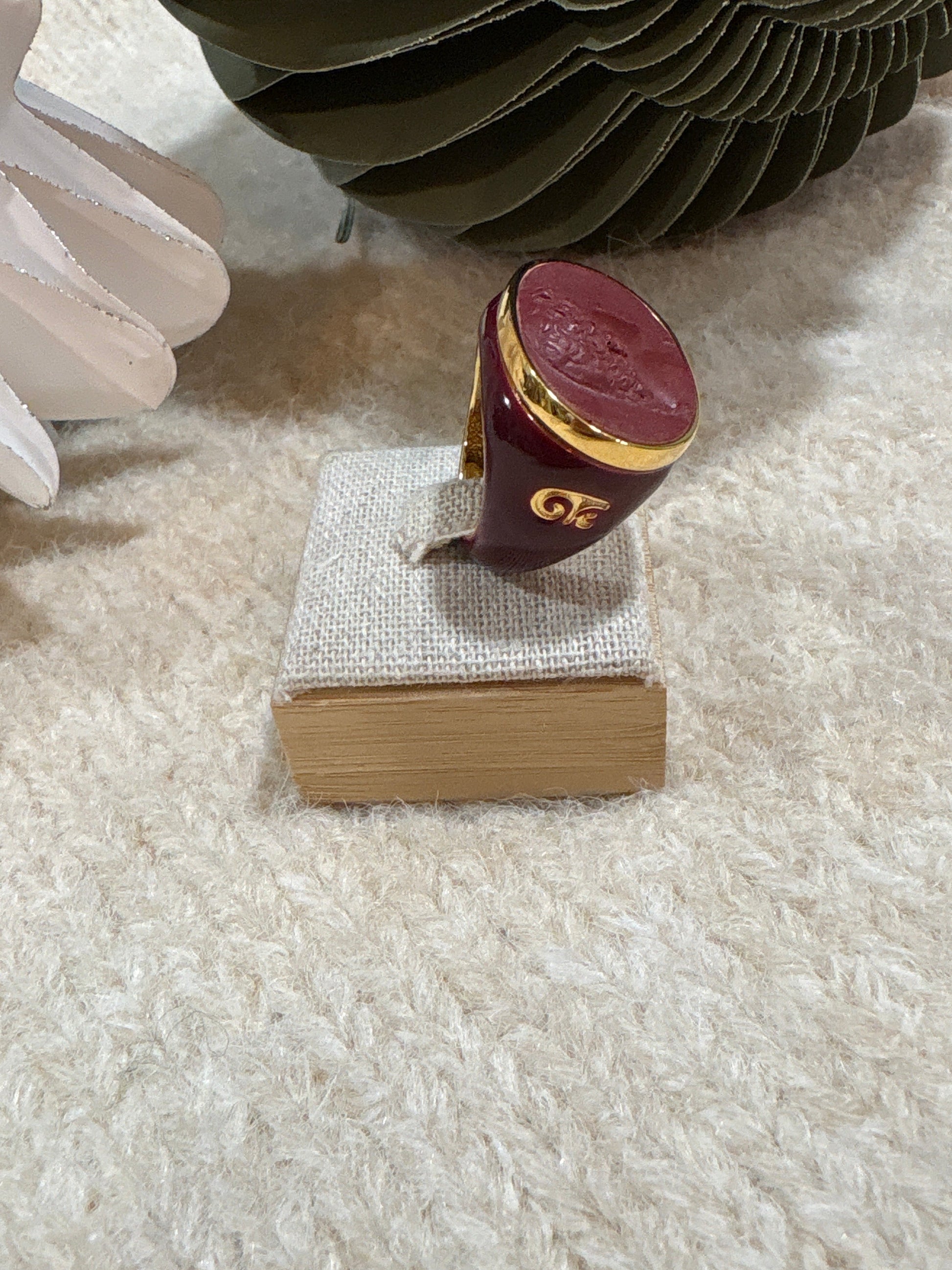 Bague large ovale en plexiglas bordeaux surmontée d’une plaque en poudre de marbre bordeaux sertie en plaqué or 18 carats.
