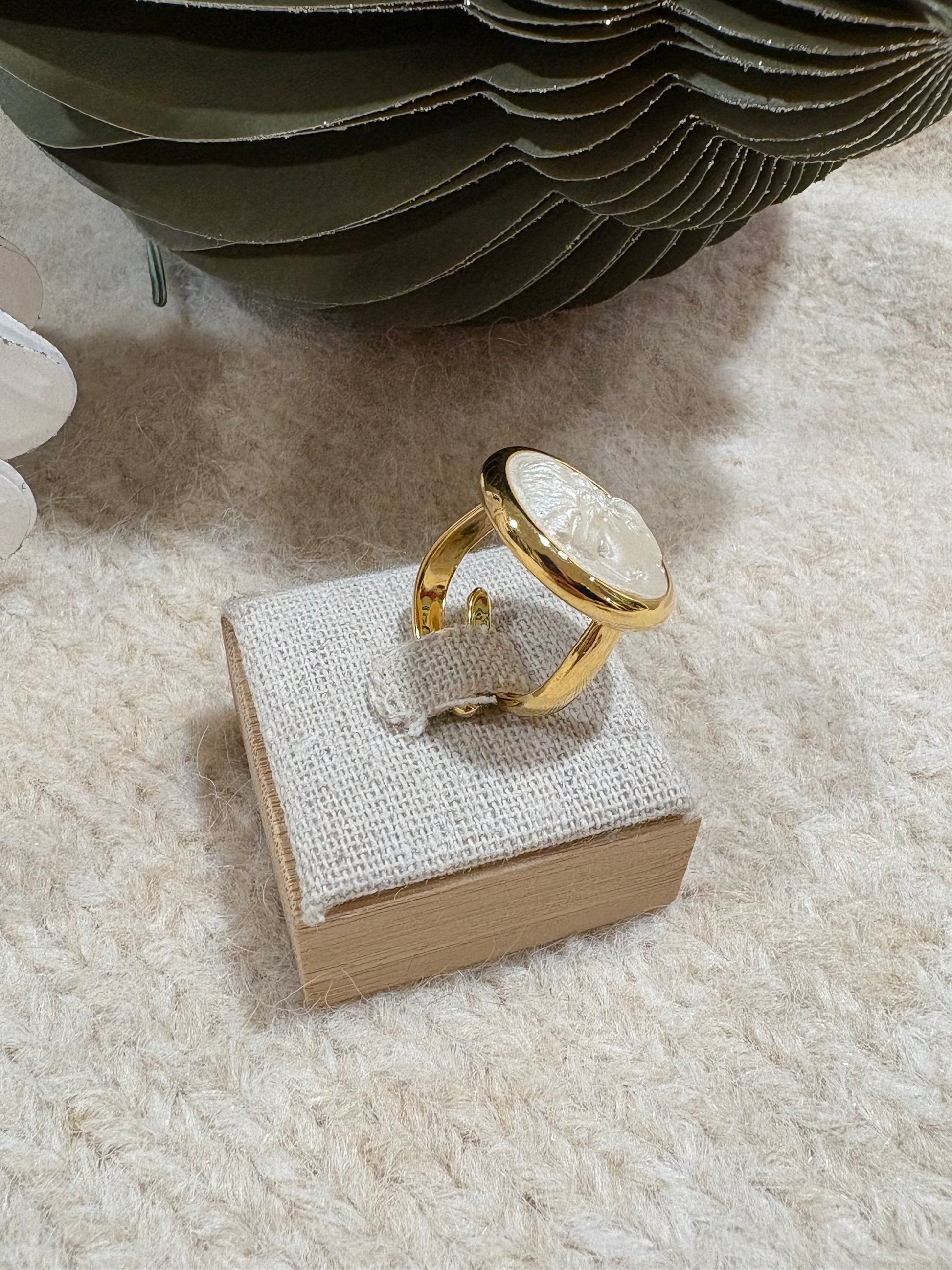 Bague large en plaqué or 18 carats, surmontée d'une plaque en poudre de marbre ivoire nacrée, sertie en plaqué or 18 carats.