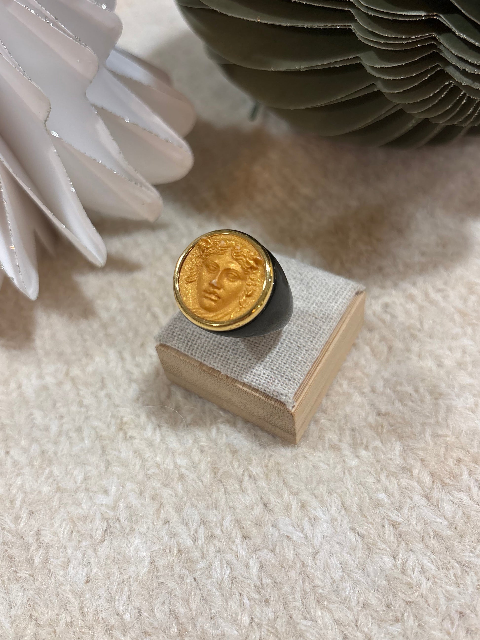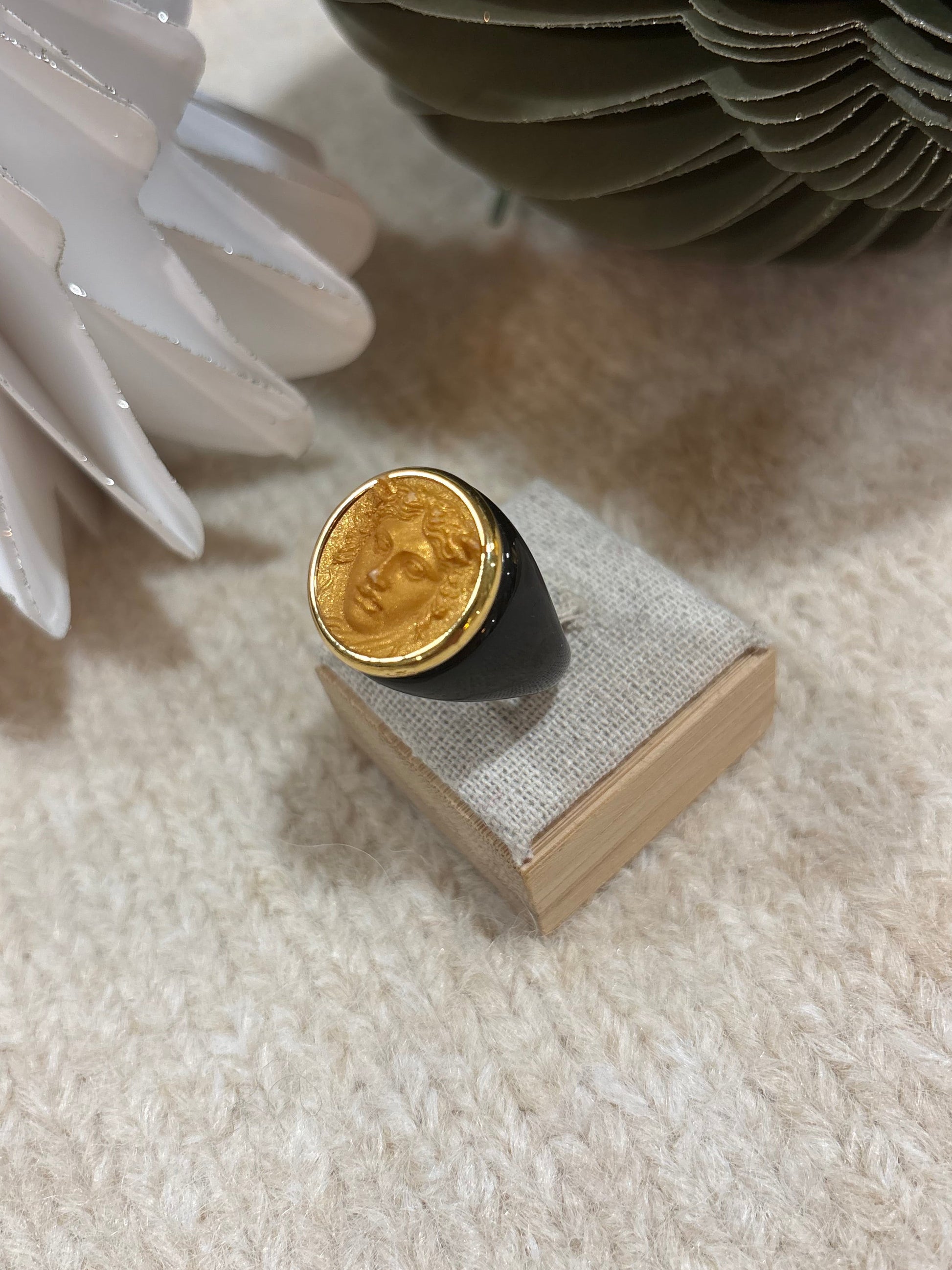 Bague large ronde en plexiglas noire surmontée d’une plaque en poudre de marbre moutarde.