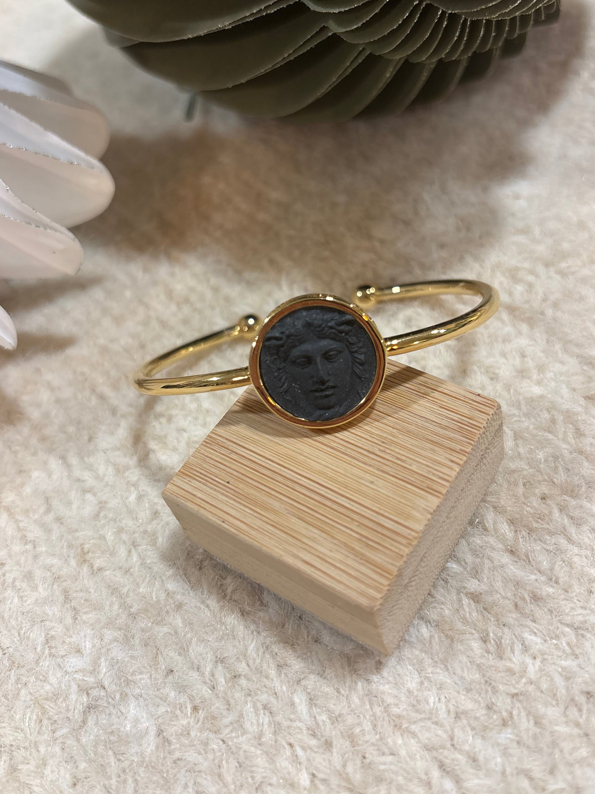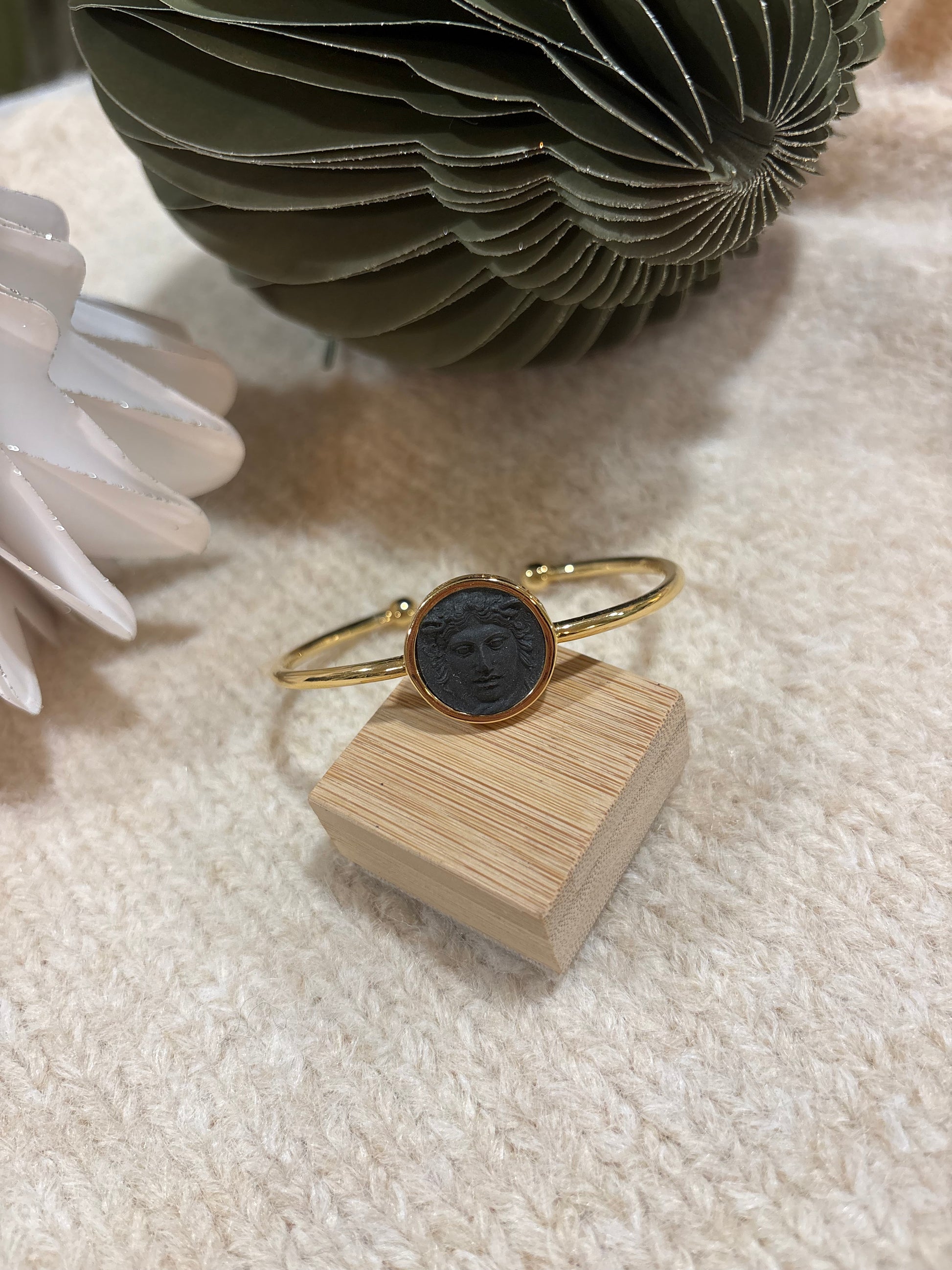 Jonc en plaqué or 18 carats, surmontée d'une plaque en poudre de marbre noire, sertie en plaqué or 18 carats.