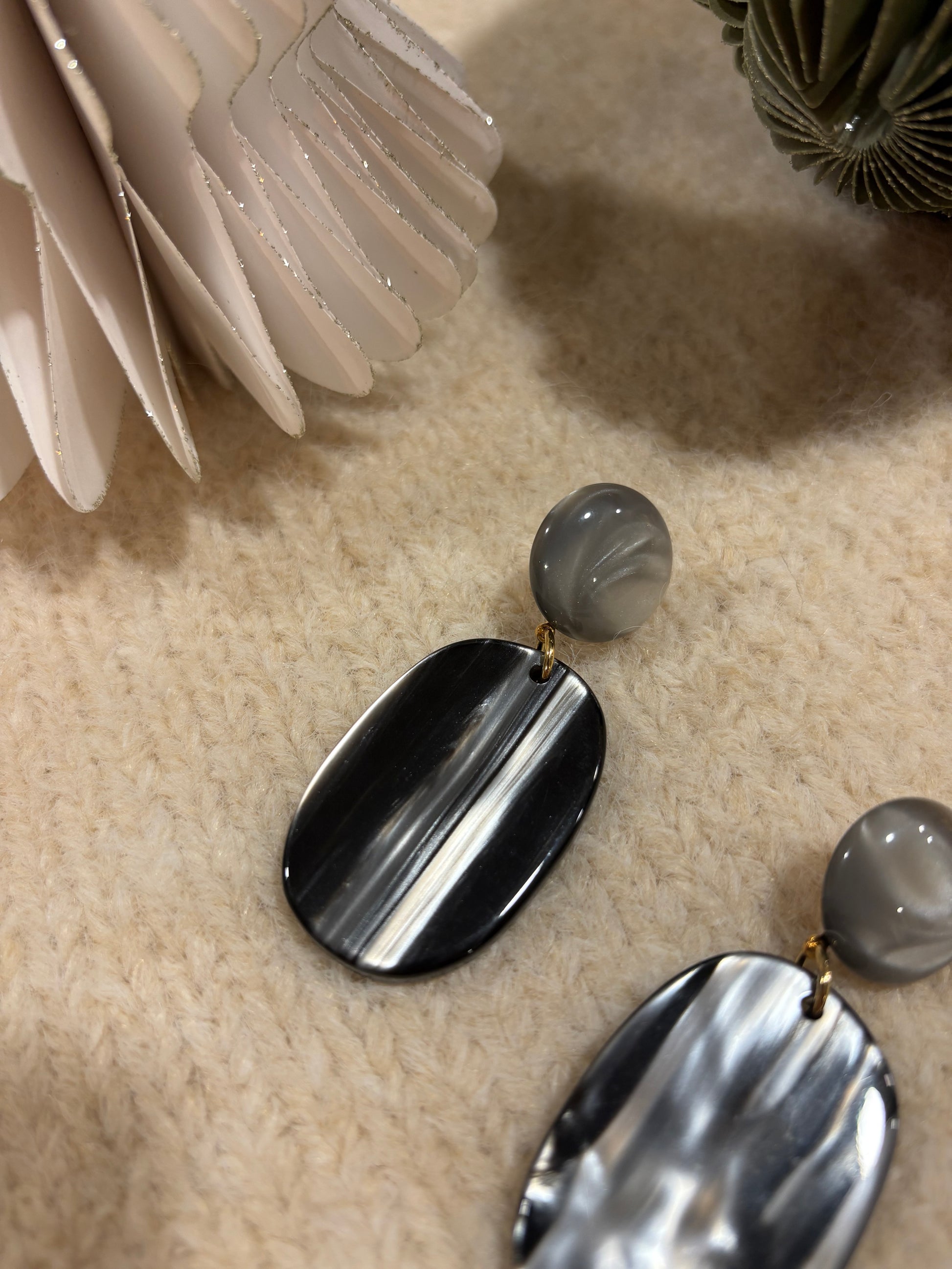 Boucles d’oreilles percées en acétate de cellulose. Couleur : onyx et noir