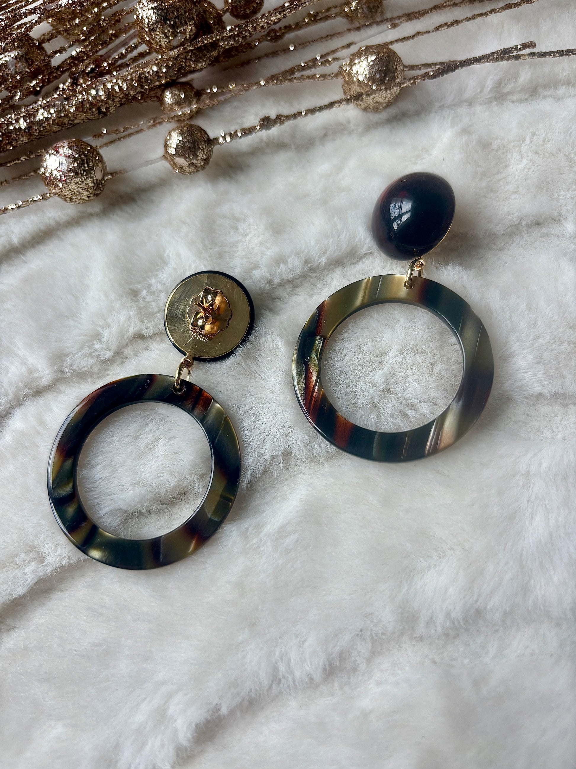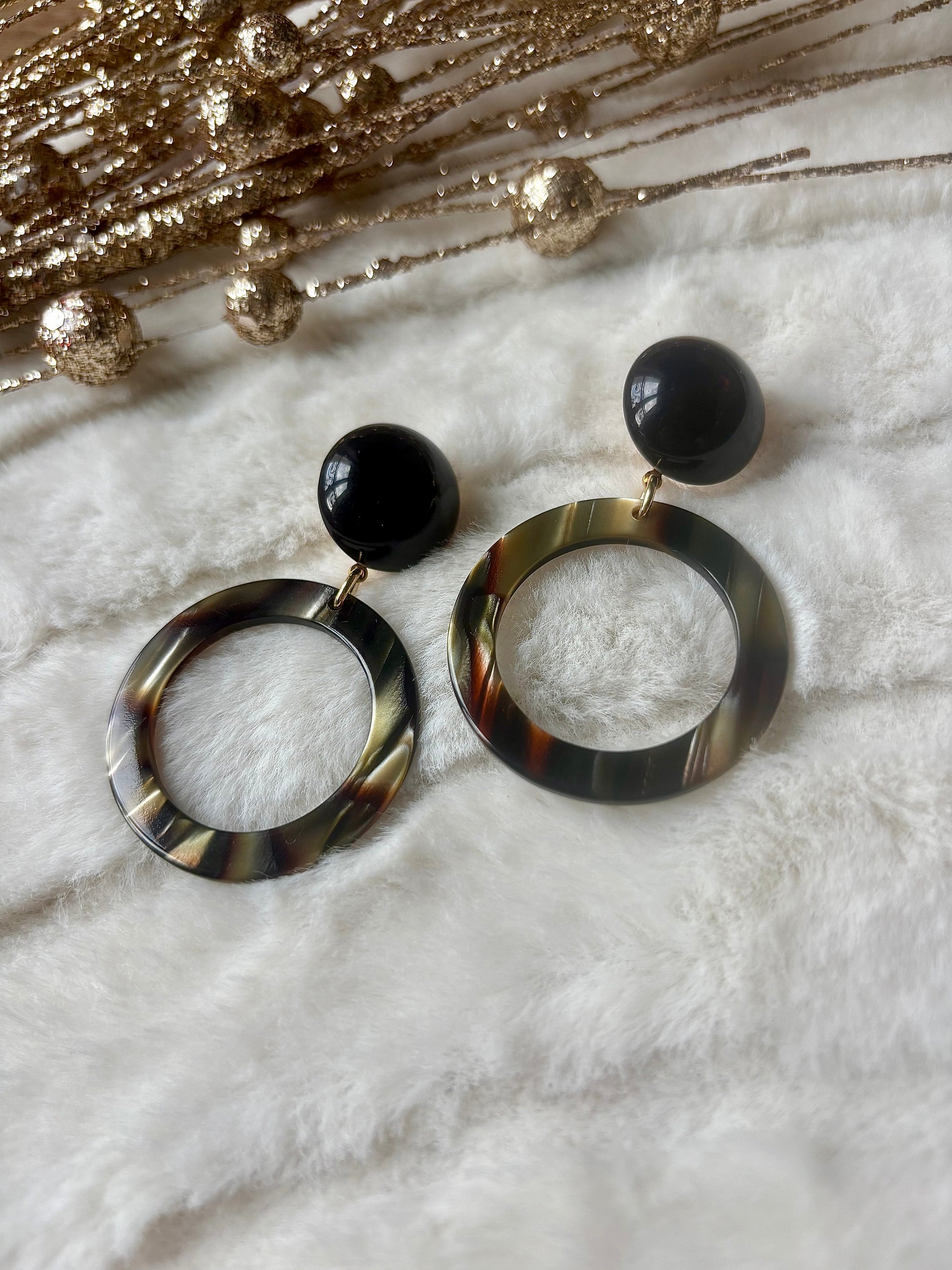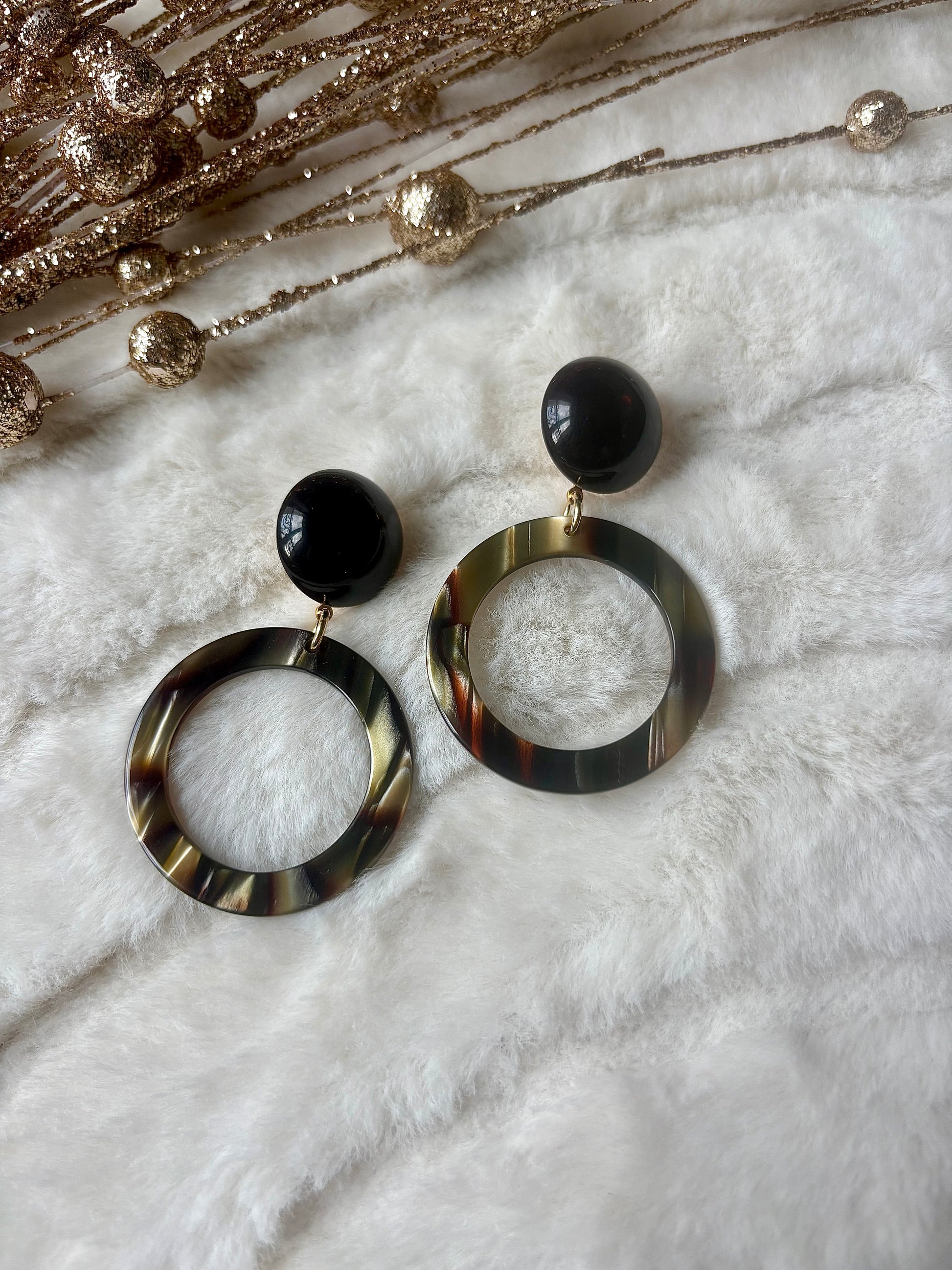 Boucles d’oreilles percées en acétate de cellulose. Couleur : onyx et kaki