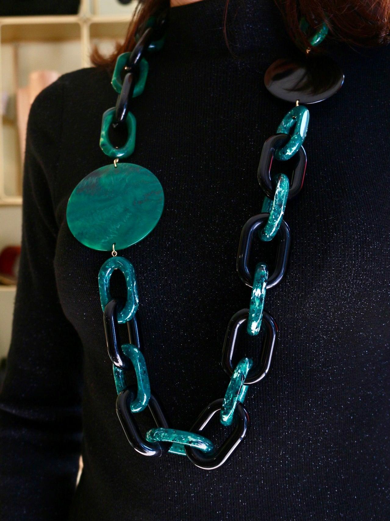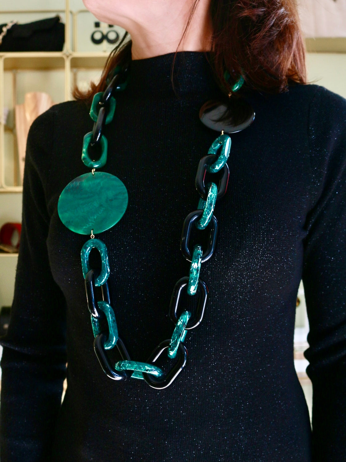 Sautoir Francine Bramli en résine naturelle verte et noire.
