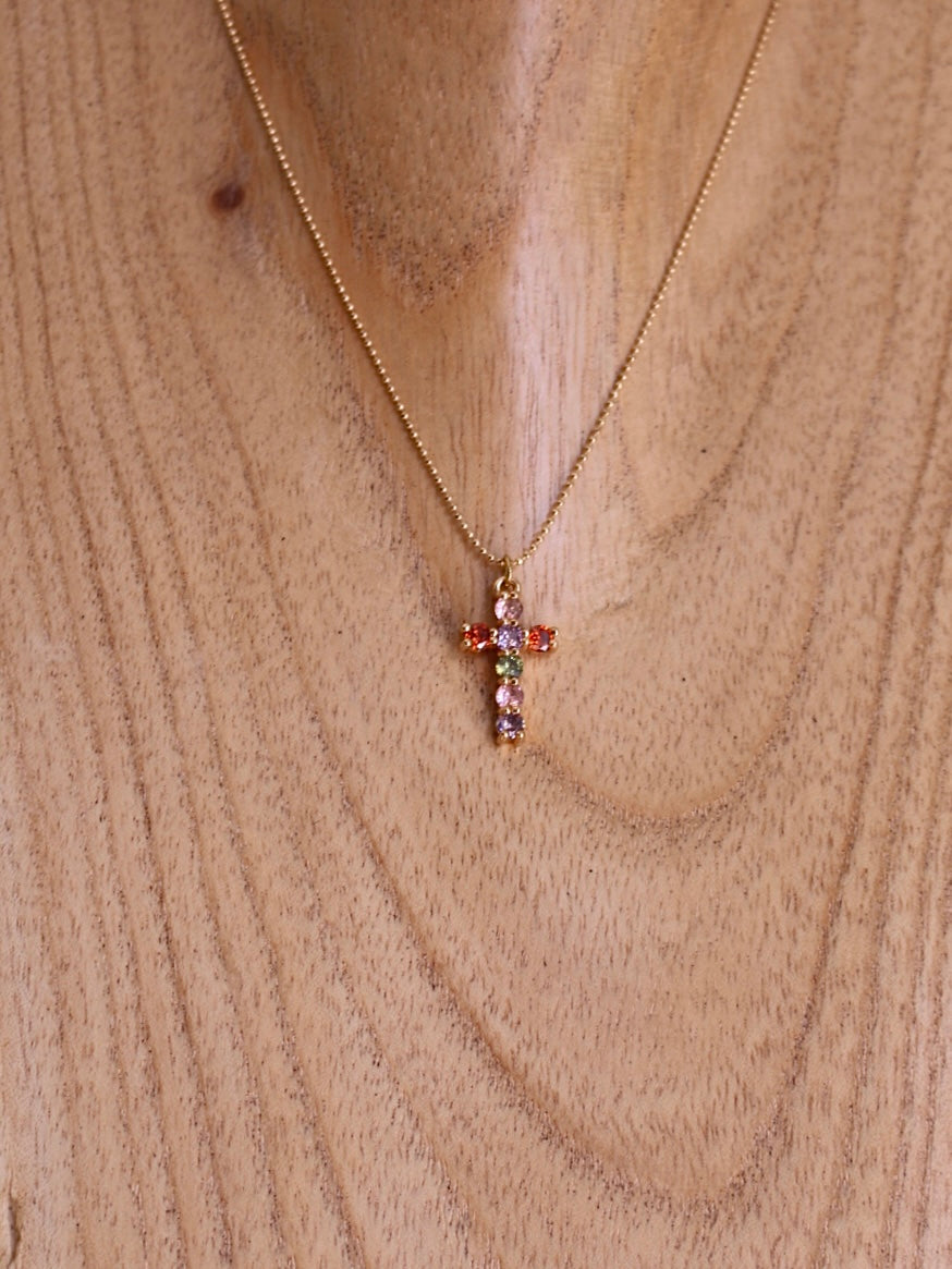 Sautoir en chaîne boule diamantée avec fermoir coulissant, médaille avec croix multicolore.