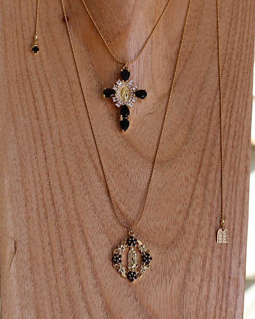 Sautoir en chaîne boule diamantée avec fermoir coulissant, médaille avec croix noire