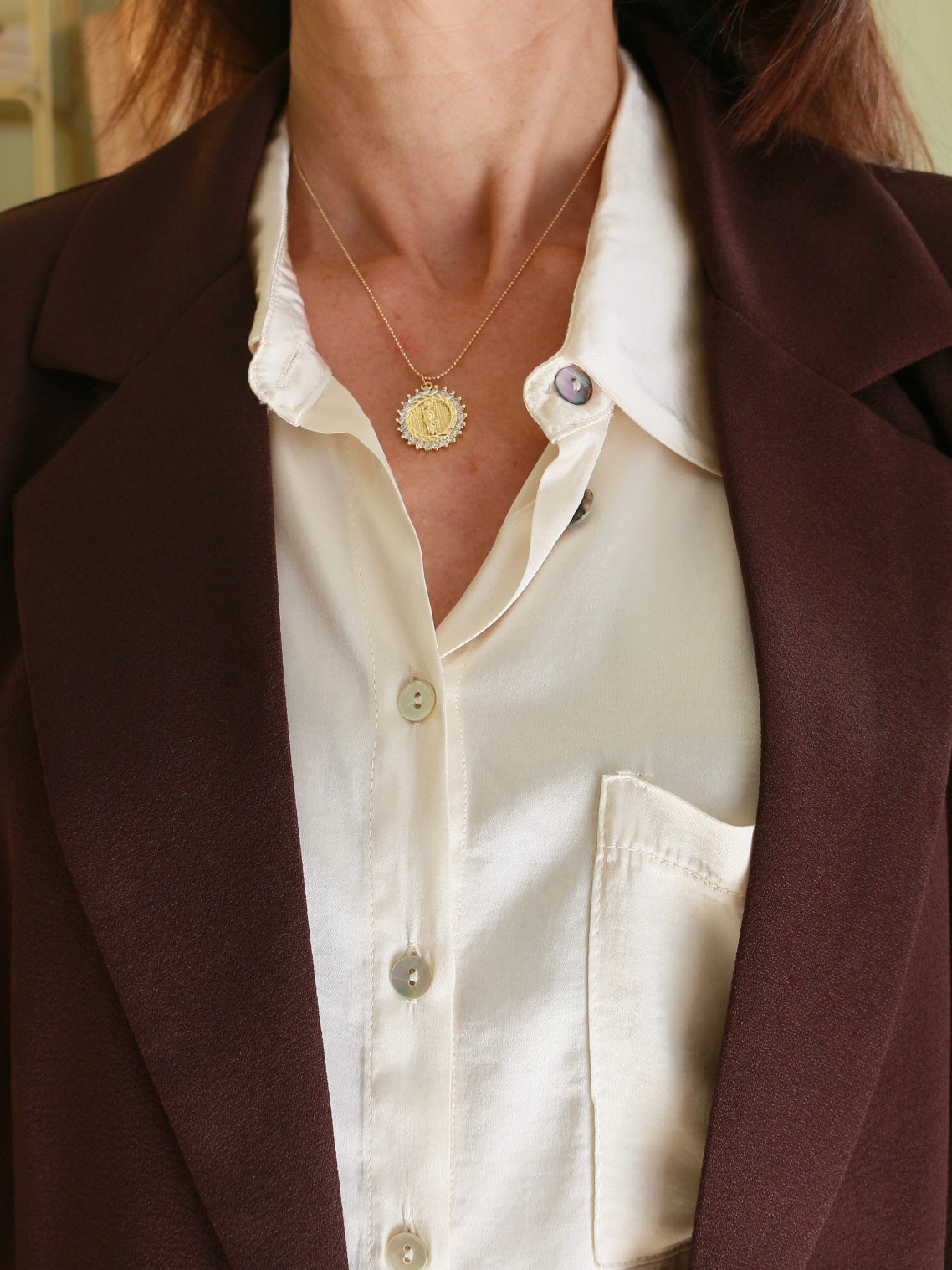 Sautoir en chaîne boule diamantée avec fermoir coulissant, médaille avec madone
