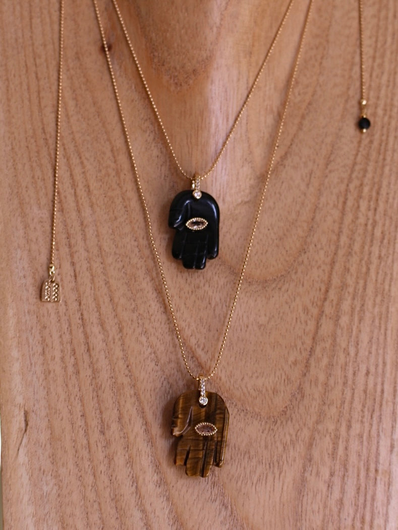 Sautoir en chaîne boule diamantée avec fermoir coulissant, médaille avec main de Fatma marron ou noire.